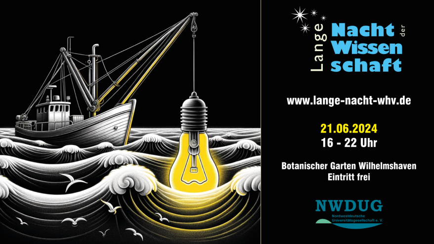 Wissenschaft aus Wilhelmshaven! Das kann nun zum dritten Mal bei der Langen Nacht der Wissenschaft der NWDUG im Botanischen Garten in Wilhelmshaven erlebt werden. Bei 13 wissenschaftlichen Einrichtungen und Vereinen gibt es Wissenschaft zum Anfassen. Es gibt viel zu entdecken und die neusten Erkenntnisse über die aktuellsten Forschungen aus Wilhelmshaven. Es gibt wieder Experimente zum Mitmachen, viel zu Beobachten und zum selbst erforschen - für Groß und Klein. Kommen Sie mit den Wissenschaftlerinnen und Wissenschaftlern aus der Stadt ins Gespräch und erfahren sie alles über die neuesten Ergebnisse der Projekte und Institute.